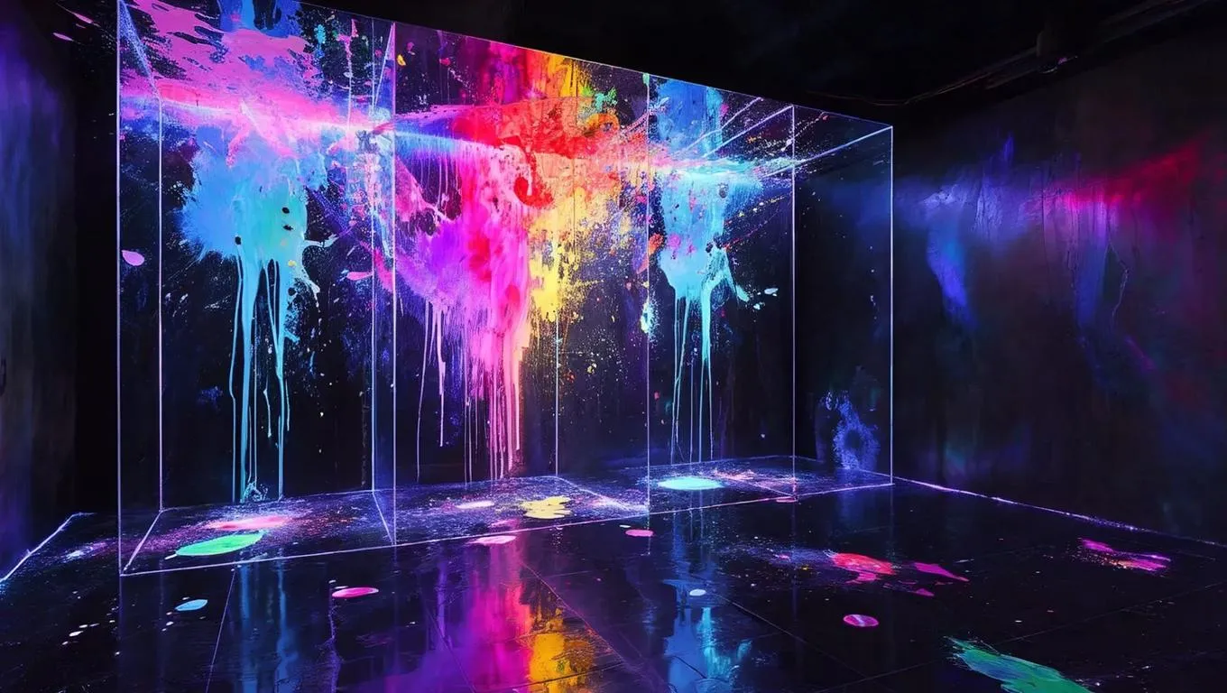Transform your visuals with AI Glow In The Dark effects—vibrant illuminated paint splashes on transparent walls, set in near-black cubic spaces. Achieve surreal, high-contrast artistry with ethereal color glows, dreamlike ambiance, and 4K detail. Perfect for exploring light/shadow juxtaposition, creating immersive, professional-grade content through AI-powered image/video generation and editing tools.