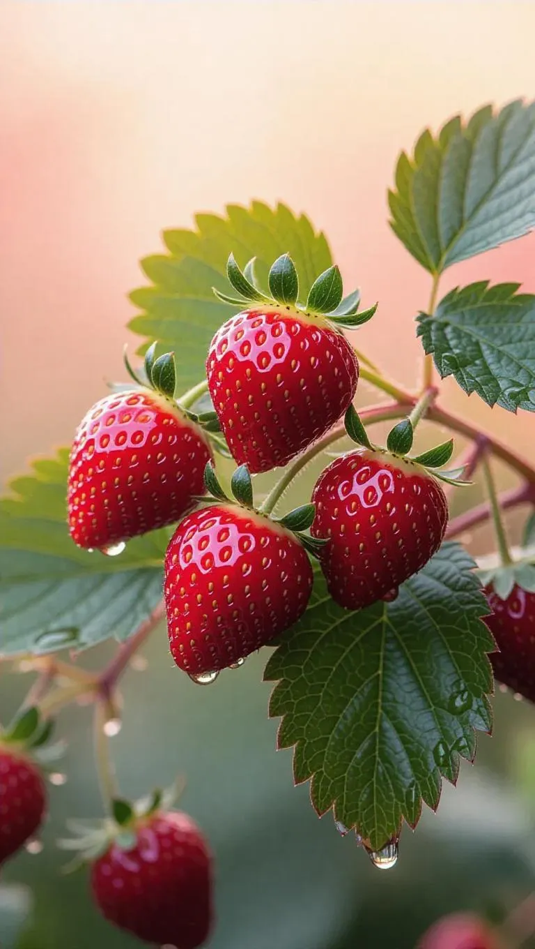 Generate lifelike AI images of vibrant red strawberries with glistening water droplets on branches, nestled among lush green leaves. Perfect for food photography, ads, or nature-themed visuals. Elevate your content with vivago.ai's realistic AI image tools and soft-focus backgrounds.
