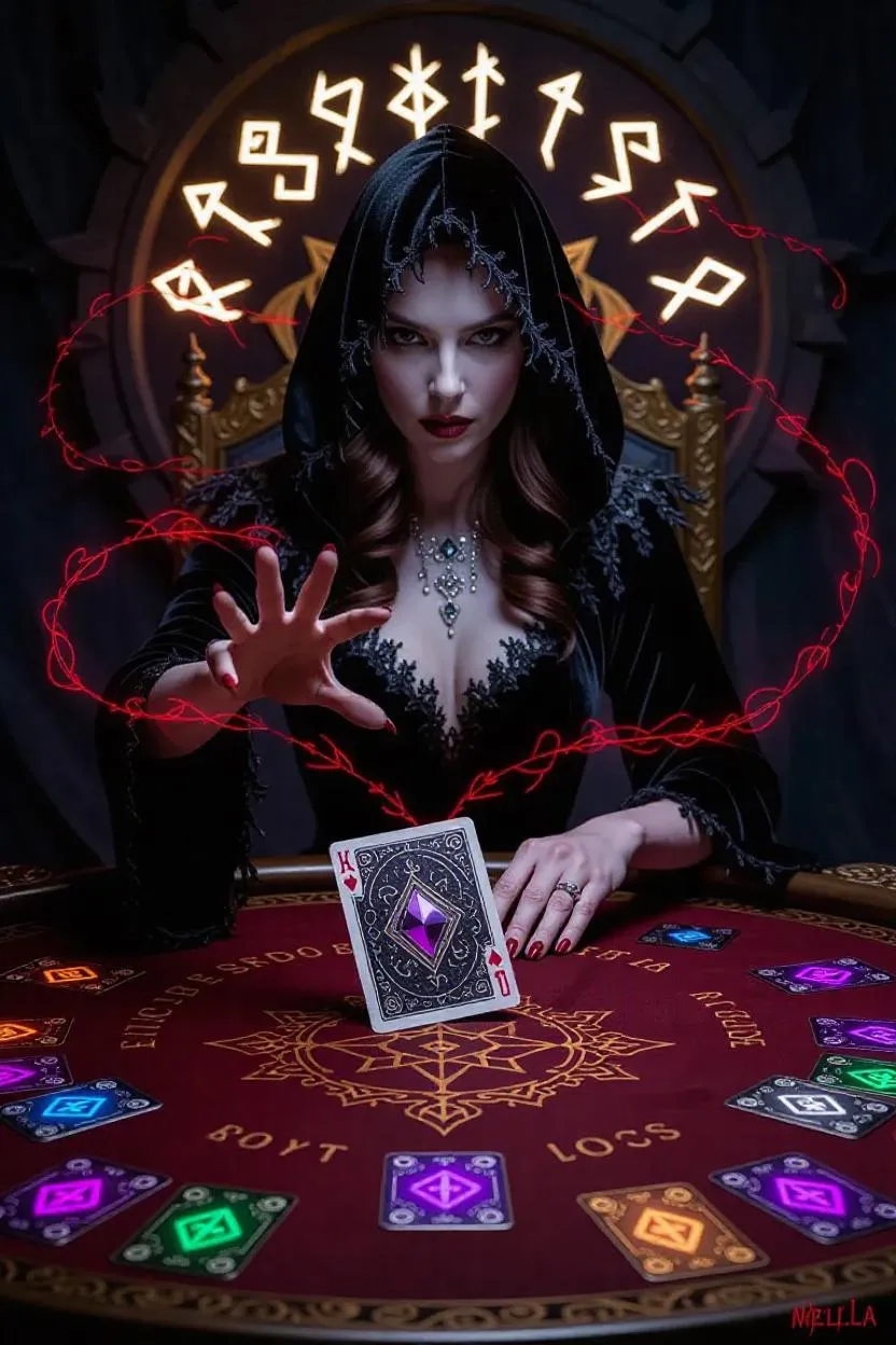 A lone, eerie sorceress, casting a spell of dominance in a decrepit, mystical realm, playing a majestic, gemstone-encrusted card, radiating an aura of dark, arcane power, with tendrils of crimson energy swirling around her, wearing a tattered, black velvet cloak, against a backdrop of glowing, ethereal, otherworldly runes, on a worn, ornate, wooden card table, surrounded by scattered, gleaming, metallic cards of varying rarity, faction symbols glowing with an ominous light, mana cost etched in a curling, silver script.