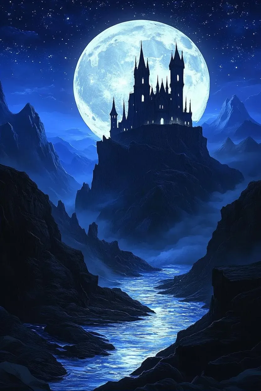 Gothic fantasy landscape with a glowing full moon, dark castle on cliffs, and winding moonlit river. AI-generated imagery captures eerie enchantment, stark contrasts, and painterly details. Misty peaks, starry skies, and paper quilling textures evoke mystery. Create 8K gothic nightscapes with Vivago.ai's AI art tools for hauntingly beautiful, detailed fantasy scenes.