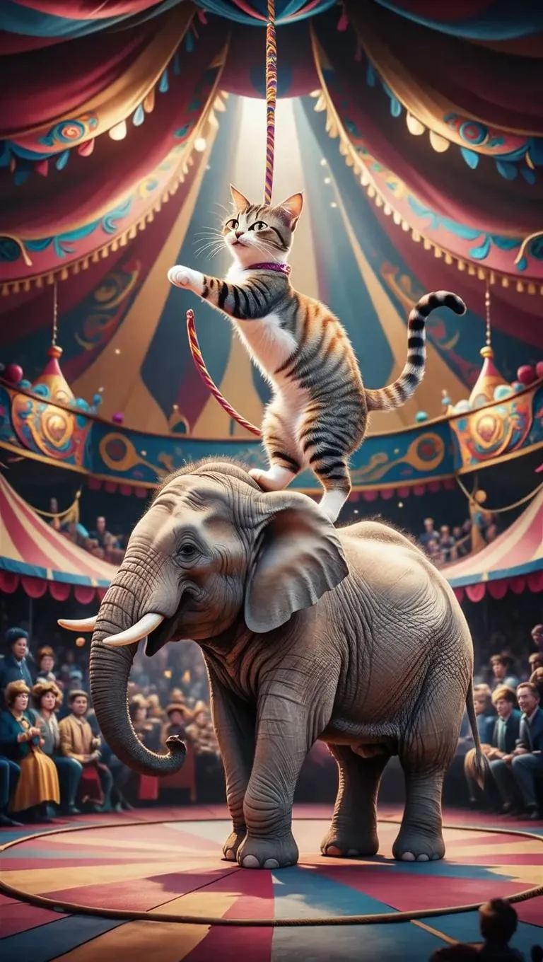 Experience an AI-generated circus scene featuring Gato the acrobatic cat and Elefantista the balancing elephant. Vibrant big top tent backdrop with Cyberpunk-Pixar flair captivates the crowd in this dynamic, whimsical performance.
