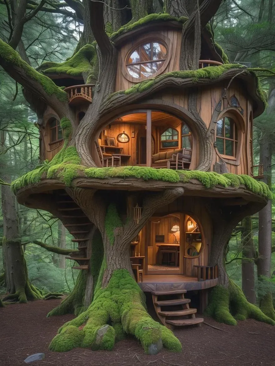 Discover an enchanted treehouse nestled in a mystical forest. Built within a hollow trunk, this cozy retreat blends seamlessly into lush surroundings. Featuring rustic charm with compact, simple furnishings, it offers an adventurous yet tranquil nature escape. Perfect AI-generated imagery for fantasy scenes, serene getaways, or eco-friendly designs. Elevate visuals with this magical hideaway merging creativity and tranquility.