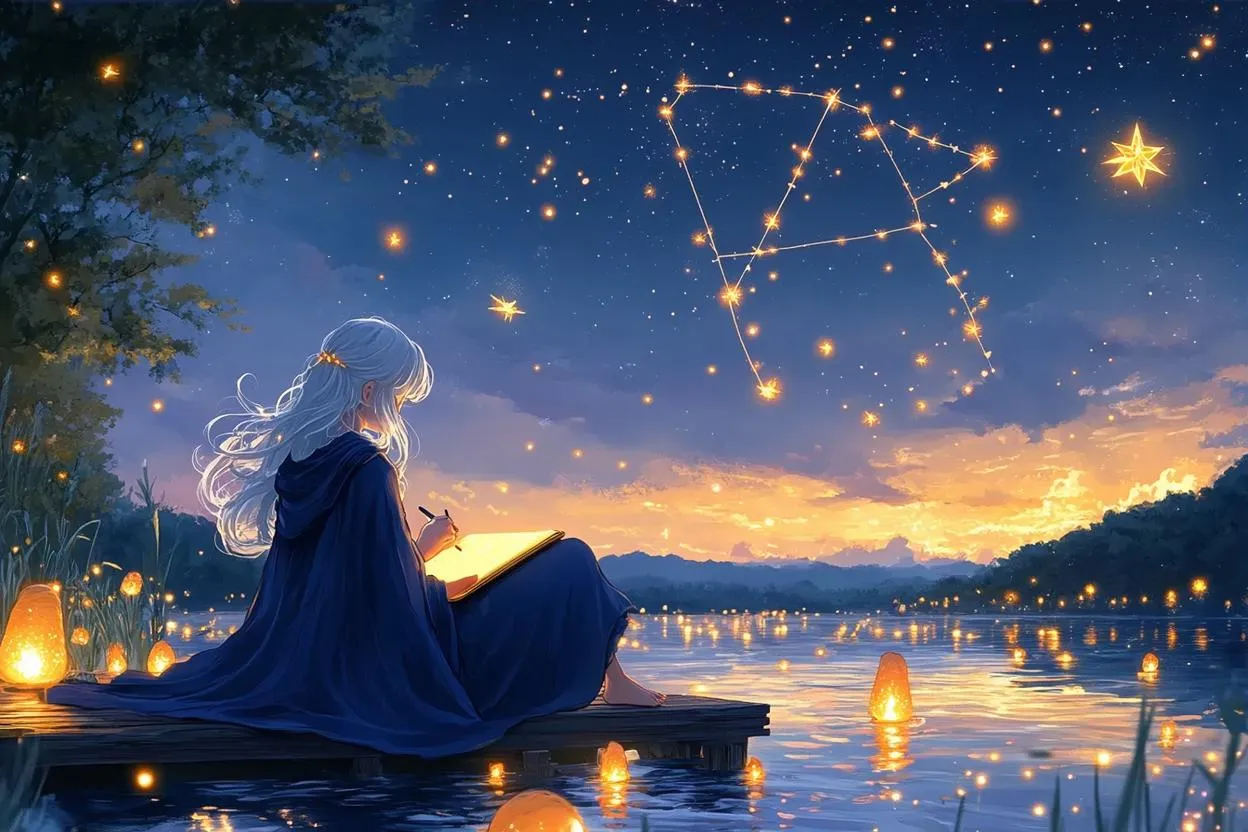 Craft enchanting AI-generated anime art with Vivago.ai. Visualize a starlit lakeside dusk featuring a celestial traveler, glowing constellations, and Ghibli-inspired watercolor scenery. Generate serene summer nights, luminous fireflies, and nostalgic fantasy atmospheres effortlessly. Perfect for cinematic, dreamy visuals with celestial accents. Transform your vision into mesmerizing anime-style artwork.