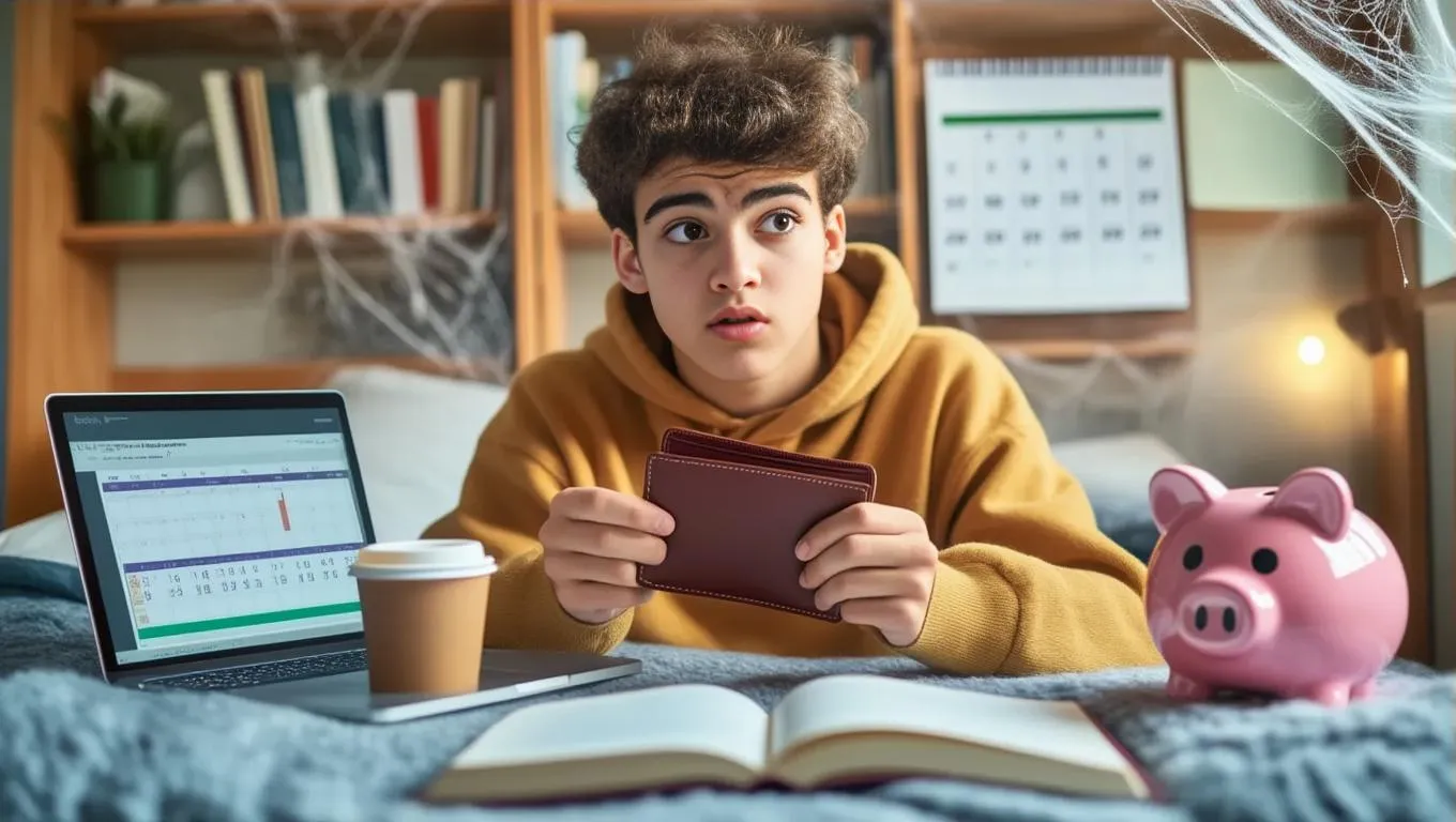 Generate an AI image of a stressed college student in a cozy dorm, clutching an empty wallet beside textbooks, coffee, and a laptop displaying a budgeting app. Soft warm tones highlight a calendar nearing month-end and a cobwebbed piggy bank, blending relatable financial struggles with humorous hope.