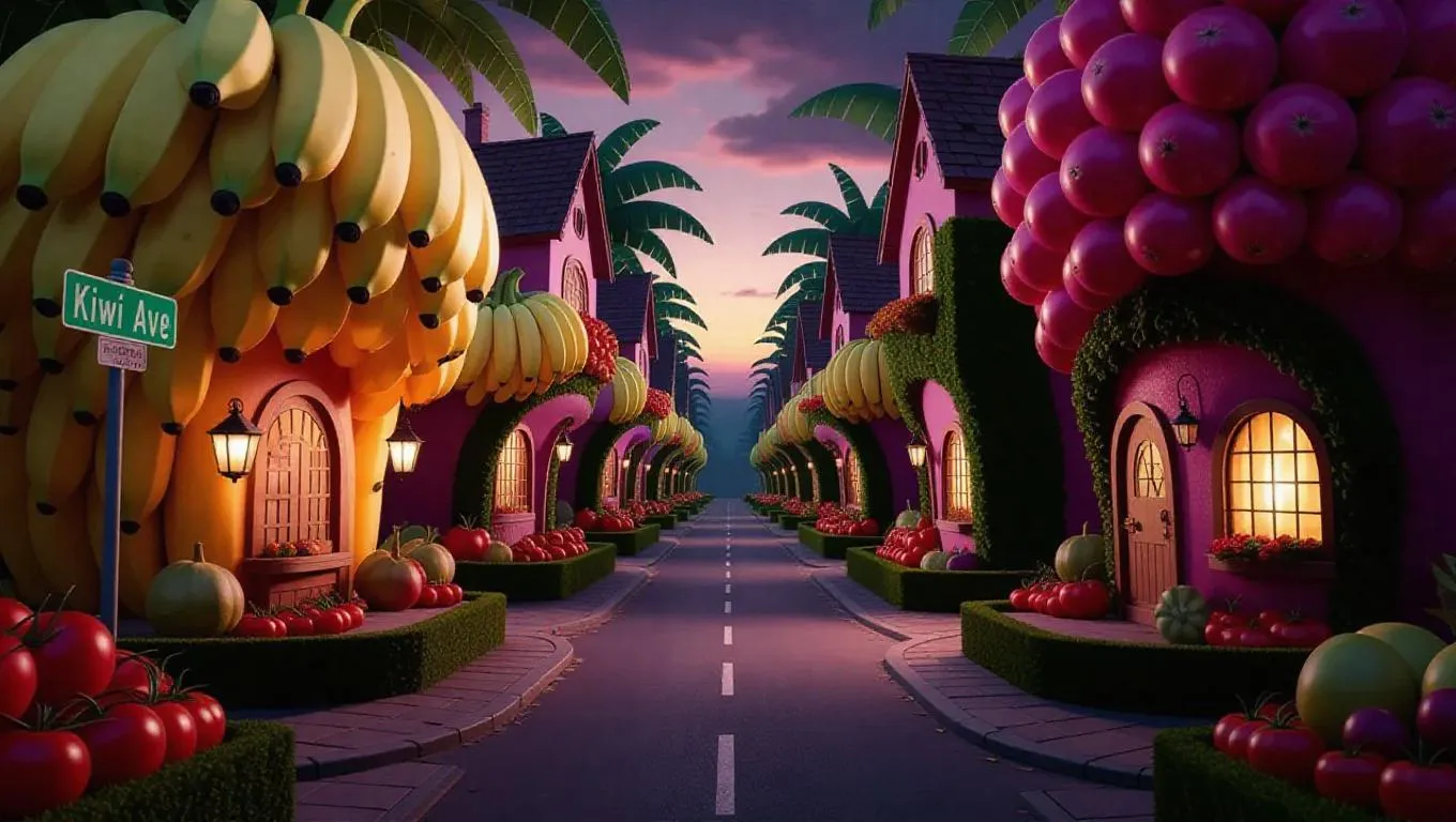 Discover a whimsical fruit city with AI-generated ethereal shelters, banana street lanterns, grape hedges, and dragon fruit-lit windows. Explore kiwi cantaloupe structures, wooden doors, and "Kiwi Ave" signs in vibrant dusk. Dreamlike AI art crafted by vivago.ai.