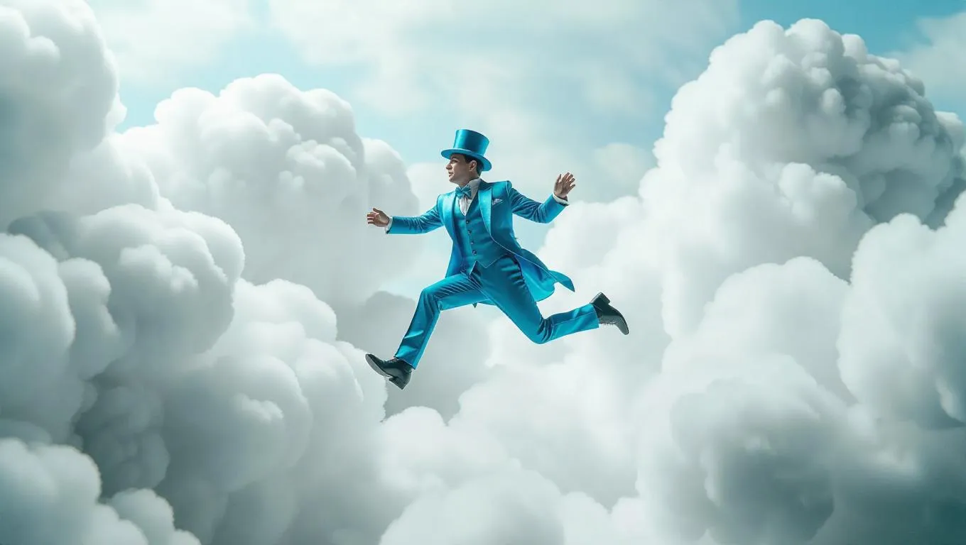 A miniature man leaps across wispy, cotton-like clouds, his tiny feet barely touching the downy peaks as he bounds through the air, his iridescent blue suit and matching top hat a stark contrast to the serene, fluffy whites and grays of the surrounding atmosphere, shot from a low, dynamic angle, with the camera rotating around him as he moves, in an hyper-realistic, dreamlike scene reminiscent of a 19th-century romanticist painting.