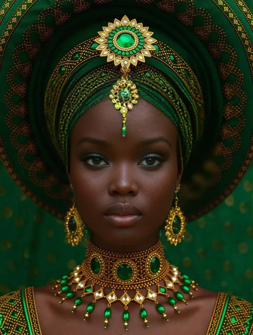 African female figure with deep brown skin, wearing vibrant traditional attire, adorned with intricate gold and green jewelry, large green and gold headdress, and bold blue eye makeup, set against a rich green background with decorative patterns, in the style of Kehinde Wiley, Yinka Shonibare, and Lynette Yiadom-Boakye, blending cultural motifs with modern artistry.