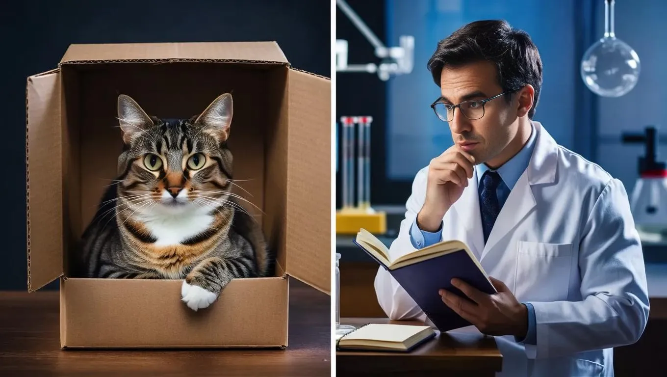 Explore AI-generated split-screen imagery contrasting a cat in a box with a pensive scientist—a modern twist on Schrödinger's thought experiment. This cinematic visual juxtaposes mystery and logic, blending curiosity with quantum theory. Ideal for sparking philosophical discourse through AI-powered creativity. Generate duality-driven, thought-provoking art with Vivago.ai's advanced image synthesis tools.