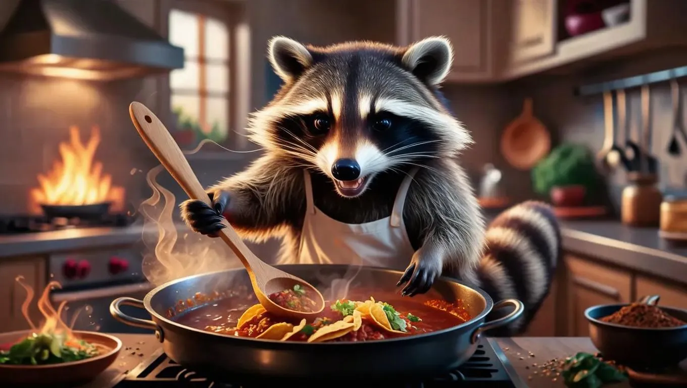 Craft AI-generated images of a passionate raccoon chef in a cozy kitchen with dramatic low-angle lighting. Highlight warm, flickering spotlights, blurred backgrounds, and anticipation as he prepares the town's best tacos. Elevate your creative visuals with VivaGo.ai's AI effects for professional-grade results.