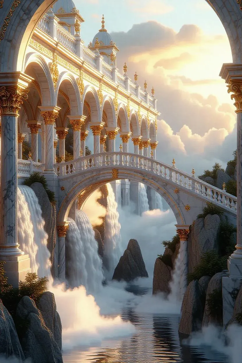 A series of intricate marble arches and bridges adorned with golden ornaments, waterfalls cascading from floating cliffs into endless clouds, bathed in a radiant sunrise glow, creating a peaceful and ethereal atmosphere, highly detailed, Polyart model, portrait 2:3