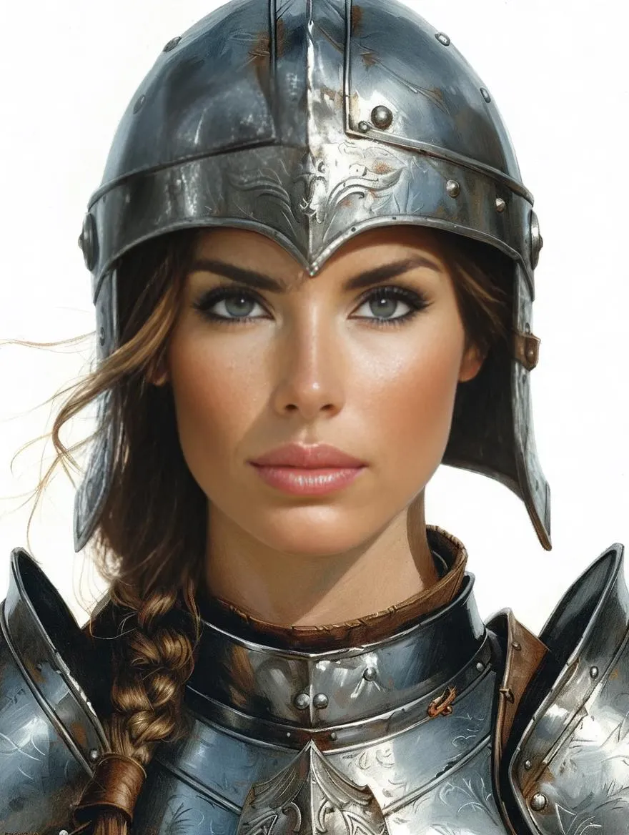 Generate AI-powered fantasy portraits with hand-drawn precision. Create striking close-up face shots of mythical female warriors in detailed plate armor and helmets against clean white backgrounds. Perfect for character concept art, digital illustrations, and heroic fantasy visuals using professional AI image generation tools.