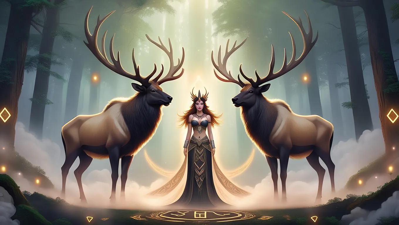 Generate divine AI art with Vivgo.ai: mystical female deity flanked by majestic giant elks, blending ethereal spirituality and surreal wildlife. Craft myth-inspired visuals, fantasy scenes, or symbolic storytelling through AI-powered image generation. Elevate prompts into professional goddess imagery with celestial elk guardians.