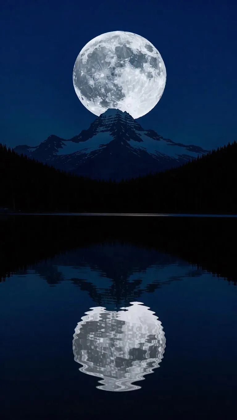 Generate stunning AI images of a serene lake under a full moon, with majestic mountain backdrop. Perfect dark blue tones enhance the mystical atmosphere, capturing the moon's reflection in crystal-clear waters. Ideal for nature-inspired digital art and creative projects.