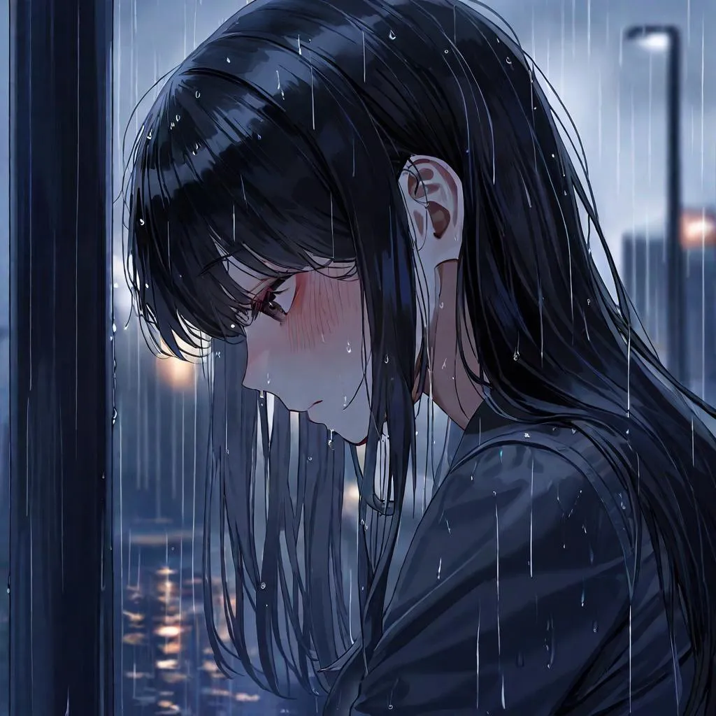 Create emotional AI art of a lonely anime girl in a rainy city scene. This dark, ambient image features a depressed high school student with wet black hair under a streetlight, evoking deep sympathy. Perfect for anime-inspired storytelling and atmospheric visuals.