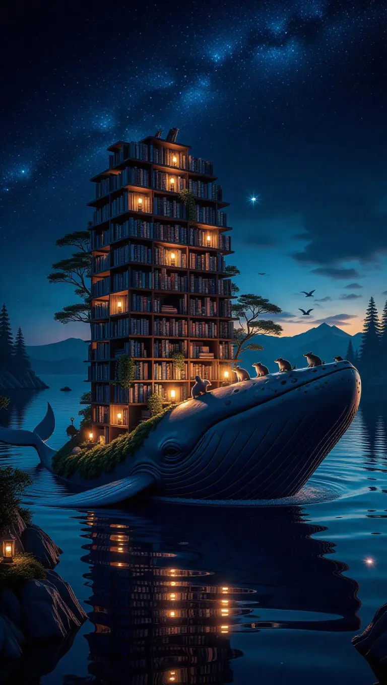 A colossal open-air library perched on the back of a slumbering whale, drifting serenely through a cosmic sea. Shelves of luminescent books sway with the nebula-infused waves. Shooting stars streak across the horizon, while paper birds flit between pages. Small creatures—mice, raccoons, and deer—huddle around glowing lanterns, listening to the universe's whispered tales. Celestial trees rise from distant asteroid islands, their branches adorned with stardust.