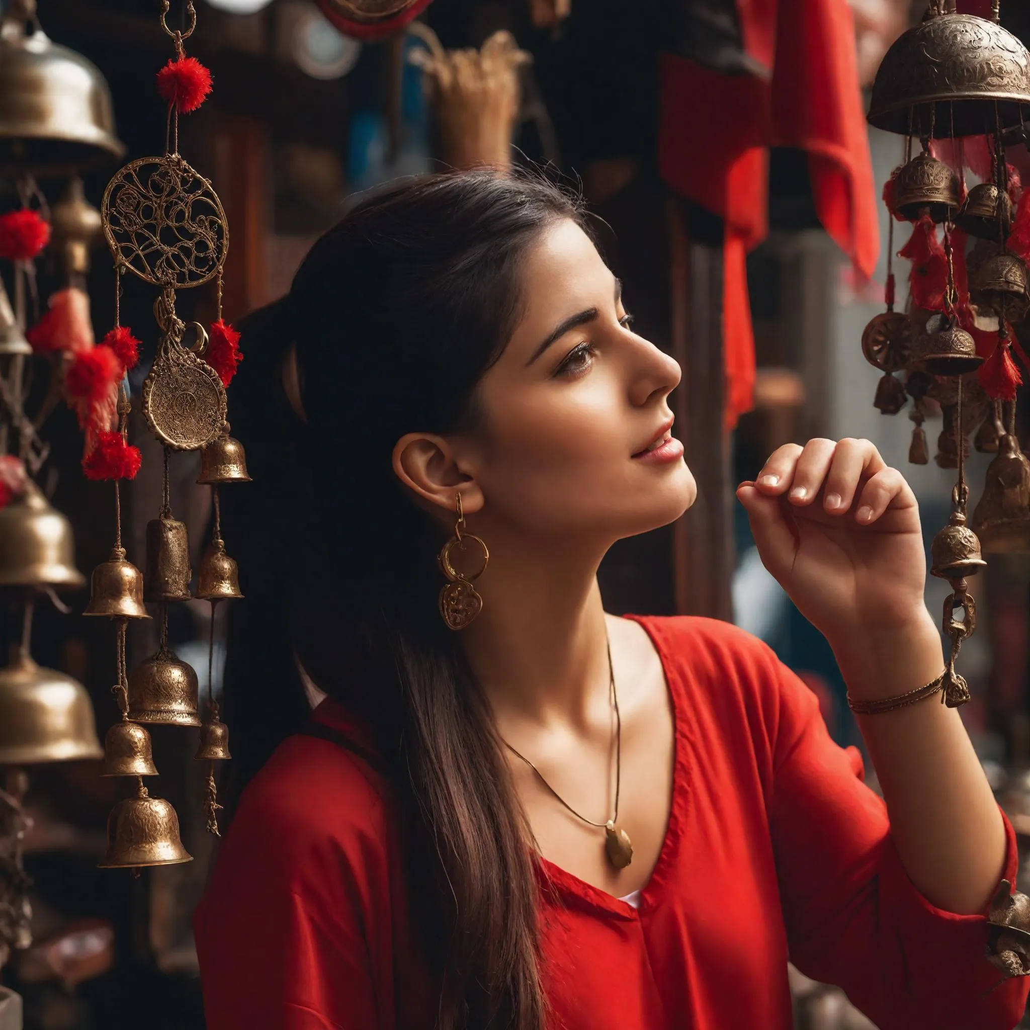 Create vibrant AI images of a curious young lady exploring ornate brass wind chimes in a festive outdoor market. Vivago.ai crafts detailed, peaceful scenes with soft lighting, intricate decor, and expressive characters—transform text into artistic visuals effortlessly using advanced AI image generation tools.