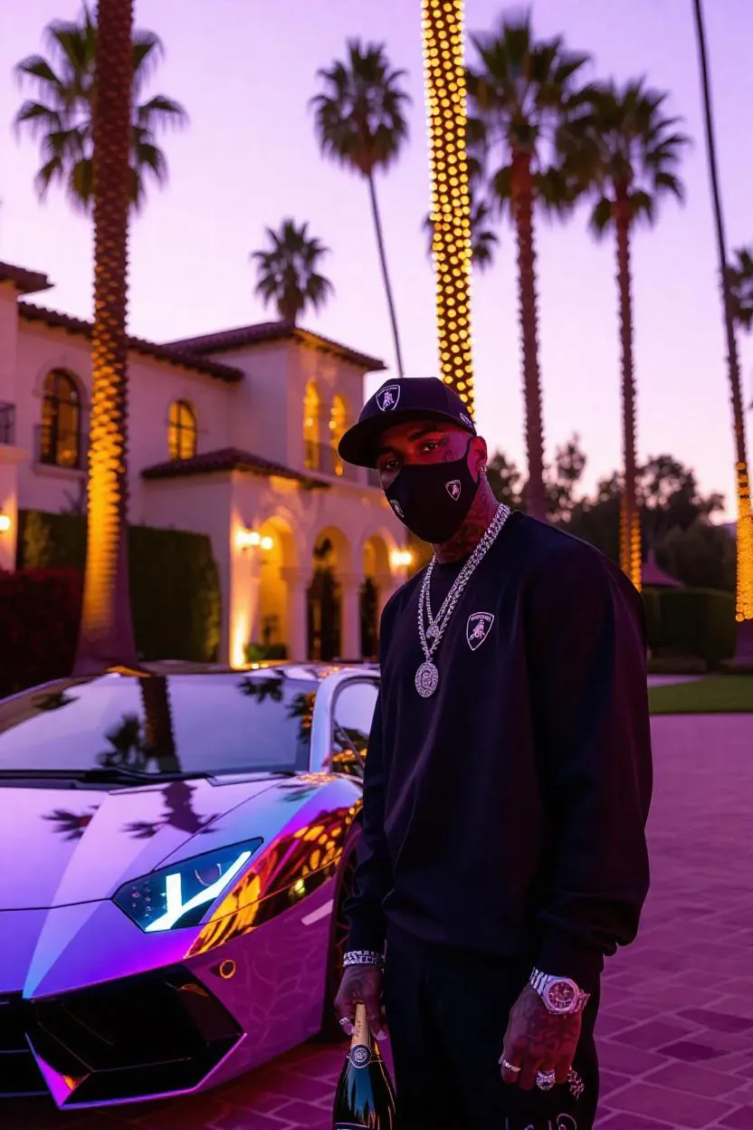 The young gangster leans against a hypergloss Lamborghini Veneno hybrid, its iridescent paint shimmering with reflections from holographic palm trees lining the Beverly Hills mansion's driveway, trunks pulsing bioluminescent cyan. Security drones orbit like fireflies. Neon smog curls around his diamond-studded Rolex, gripping a champagne bottle leaking vaporwave-purple effervescence that crystallizes mid-air, each bubble containing micro-holograms of roaring crowds. Behind his Balenciaga facemask retracting into chrome neck tattoos, the city's skyline convulses with rival gang laser tags slicing through pollution layers. Dutch angle framing warps the 2:3 composition into predatory geometry, hyperreal sweat droplets on his forehead mirroring Lambo brake lights burning through acid rain, etching fractal patterns across the mansion's quantum-lock gate.