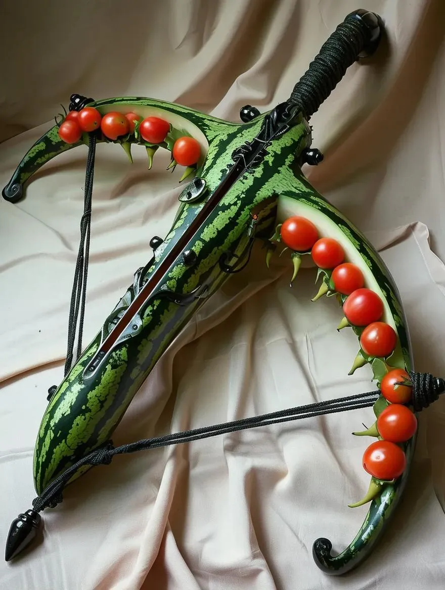 An ornate, tactical crossbow crafted from hardened watermelon shell, jagged black watermelon seeds as deadly bolts. Cantaloupe rind limbs curve like snake fangs, fibrous banana stem sinews hold string tension. Cherry tomatoes as detonating tips. Sticky fruit juice glistens on the polished weapon frame. Placed on velvet cloth, studio-lit with moody backlight, cinematic prop-style showcase.