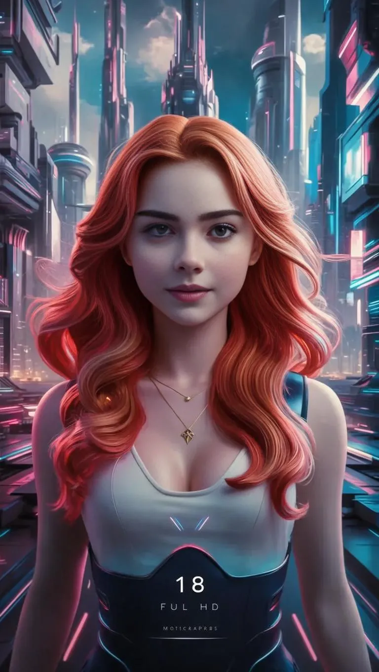 Create a mesmerizing AI-generated 3D full HD image of a youthful blonde woman with vibrant red hair, set in a futuristic cybernetic city. Neon-lit skyscrapers and hyper-realistic details contrast her natural beauty, crafting a surreal macro visual. Perfect for sci-fi art, digital design, or AI-enhanced creative projects. Optimized for vivid, high-definition storytelling.