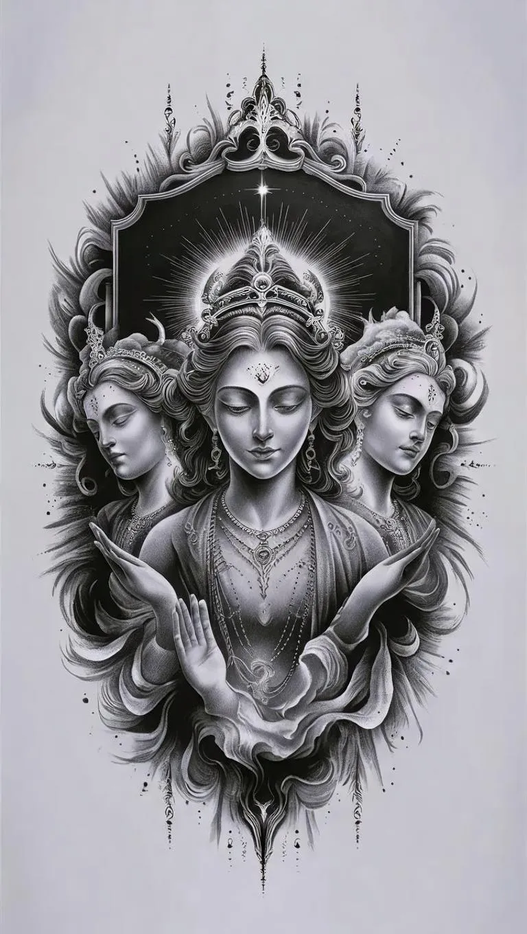 Stunning blackboard-style AI tattoo designs with graphite pencil strokes. Features divine beings, intricate details, and sacred geometry on a pristine white backdrop. Perfect for timeless, mystical body art. Create custom AI-generated tattoo templates effortlessly with VivaGo's advanced image generation tools.
