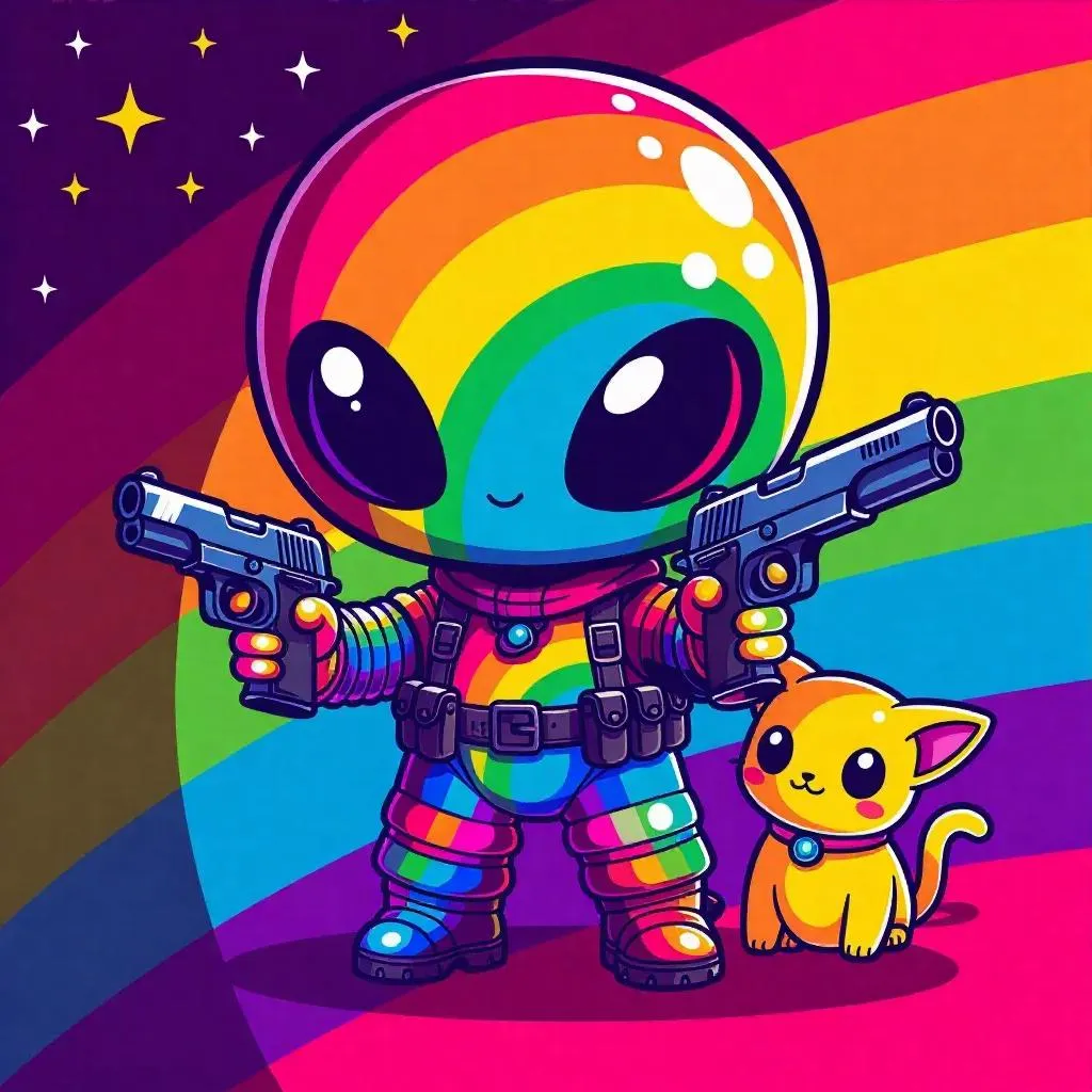 Generate a cute alien pet in chibi style, armed with a gun and wearing a vibrant rainbow outfit using vivago.ai. Create this unique, whimsical AI character image online. Effortlessly design personalized alien pets with our AI art generator.