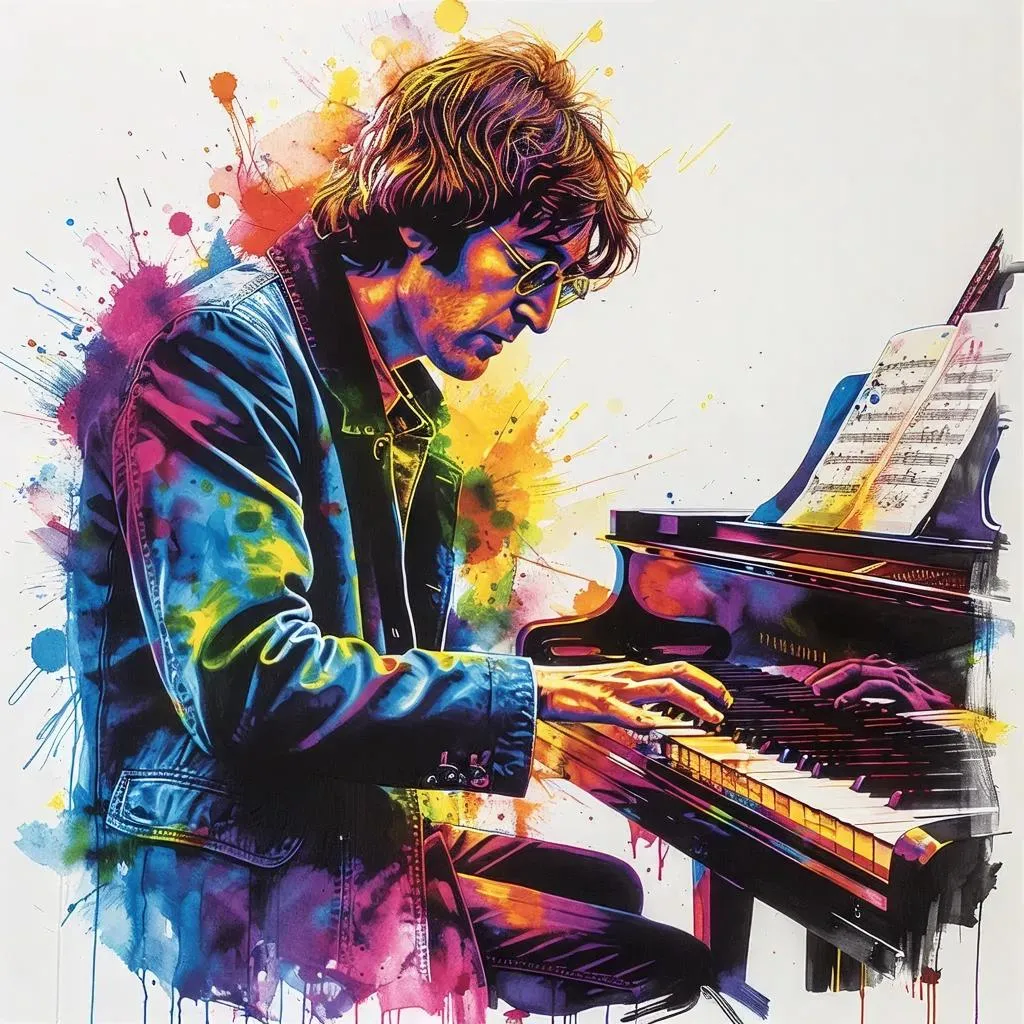 Transform text into vibrant AI art with VivaGo's screen print & silkscreen effects. Generate 1960s rock-inspired visuals featuring John Lennon playing piano, blending soft-edge styling, bold colors, and retro aesthetics. Ideal for award-winning designs, posters, or merch—create wide-shot illustrations on clean white backgrounds using AI image generation tools for retro-modern creative projects.