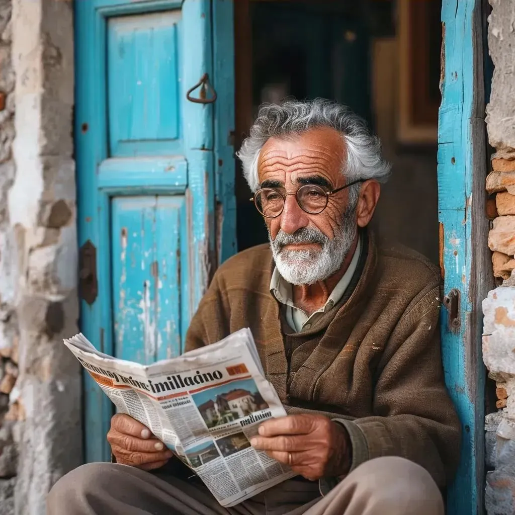 Capture the essence of Italian daily life with AI-generated photorealistic portraits. Vivago.ai crafts vibrant scenes: elderly man in traditional attire, gray beard, glasses, reading a newspaper against a sunlit rustic blue doorway. Authentic cultural photography blending bright colors, candid moments, and photojournalistic style for storytelling in rustic settings.