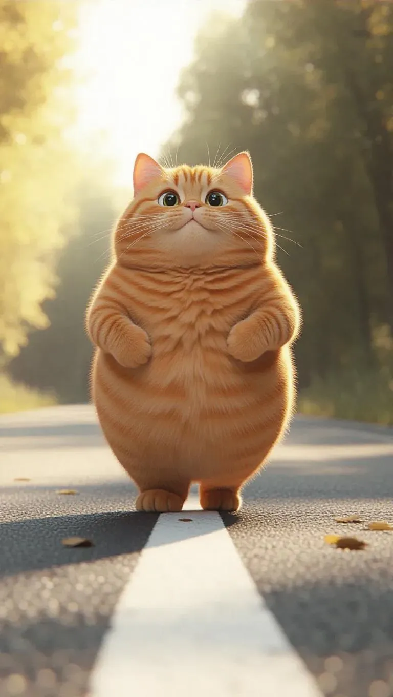 Generate a playful 3D cartoon of a chubby orange cat walking upright on a quiet road. AI-crafted with expressive charm, soft morning lighting, and anthropomorphic details. Perfect for whimsical visuals, cute character designs, and creative storytelling in vibrant 3D animation style.