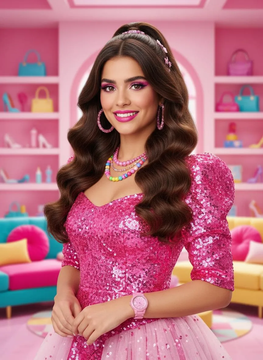 Transform the uploaded photo into a high-resolution cinematic portrait. Keep the person’s face identity accurate and realistic. Reimagine the character in the world of Barbie, with makeup, costume, and background clearly reflecting the aesthetic. Ensure the transformation matches the style (e.g., superhero armor, wizard robes, sci-fi setting, fantasy landscapes, cartoon style). High-quality, polished, and immersive look, while maintaining the original gender and key features of the person.