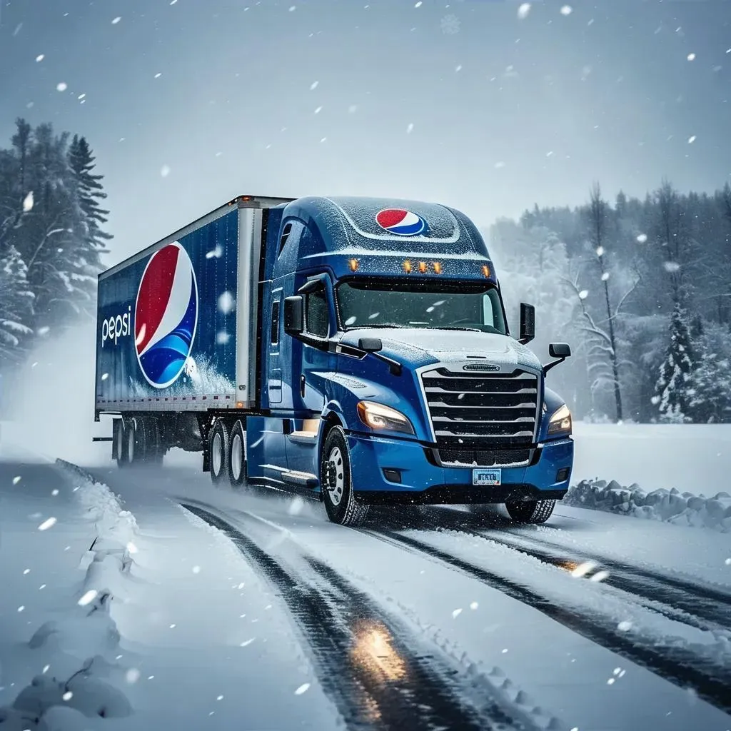 Vivid AI-generated video of a Pepsi truck navigating a snow-blanketed road, swirling snowflakes and tire tracks captured in a cinematic low-angle shot. Ideal for winter-themed ads, blending dynamic motion with serene snowy atmosphere through advanced AI video generation tools.