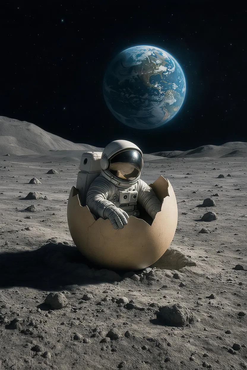 On the lunar surface, a tiny astronaut emerges from a cracked eggshell nestled in moon dust, its smooth shell faintly glowing under starlight. The astronaut, fully suited with a gleaming helmet and delicate tubing, cautiously extends a gloved hand, like a newborn explorer. Craters and jagged rocks surround the scene, with Earth hanging silently in the distant void. Fine lunar textures, soft shadows, and radiant rim light add cinematic depth. The image blends hard science fiction and poetic symbolism, capturing cosmic wonder, fragile birth, and infinite curiosity.