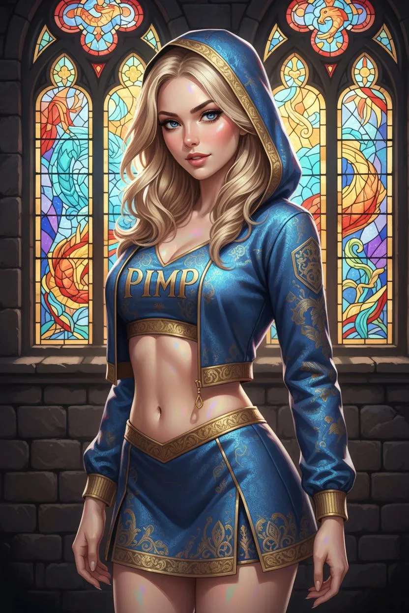 Create stunning digital art of a confident blonde woman in a blue and gold emblem jacket and mini skirt. Featuring striking blue eyes, a slender curvy figure, and vibrant Gothic stone walls with stained glass windows. Generate this highly detailed, alluring character artwork with AI.