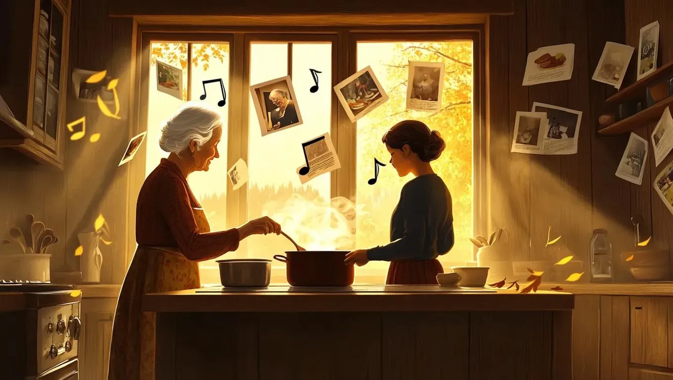 In a cozy wooden kitchen bathed in soft golden light, recipe cards and curling photographs float midair. A younger grandmother stirs a pot of soup, humming a gentle tune. A traveler stands silently at the doorframe, observing. Steam rises in the shape of musical notes, and shadows cast by the light resemble falling leaves. The scene exudes warmth and nostalgia, with a touch of magical realism.