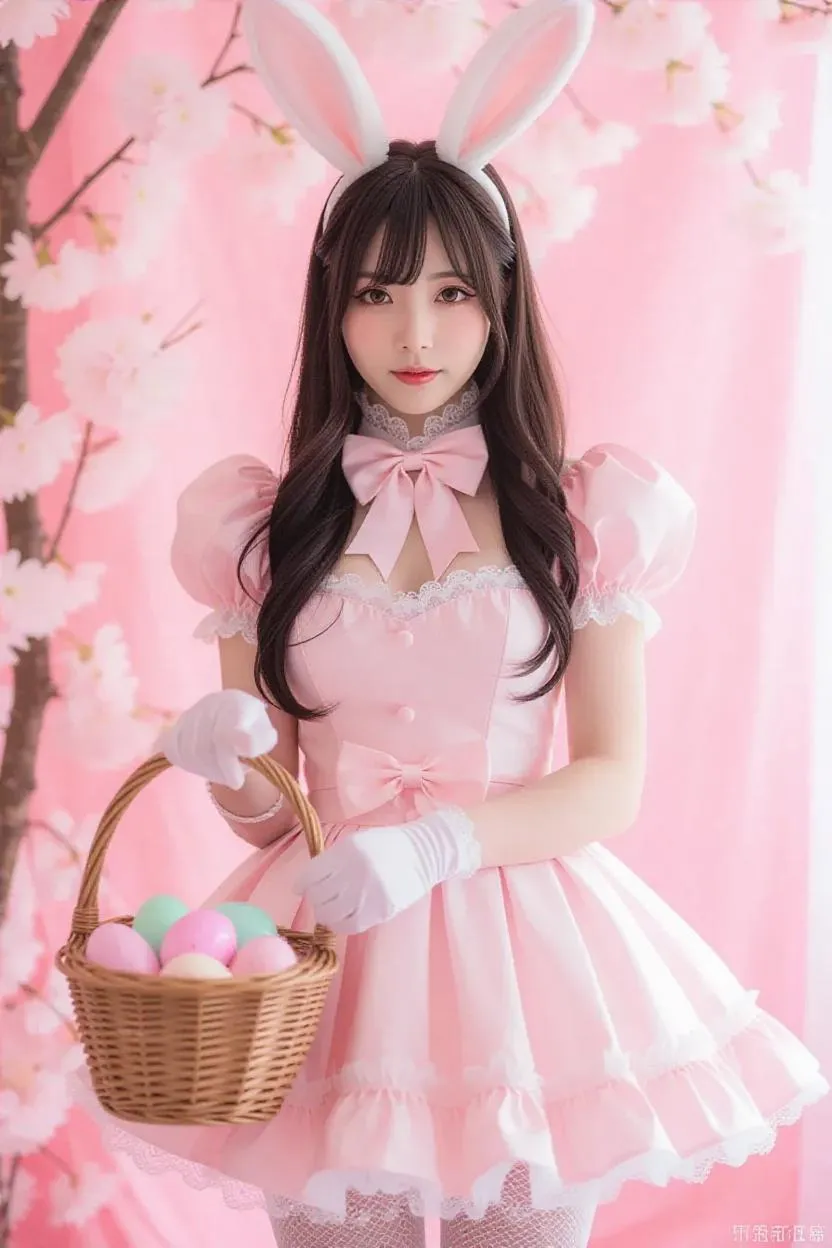 A sultry Tifa Lockhart, dressed in an elegant Easter dress with a delicate pink bow on the sash, adorned with bunny ears, white pantyhose, and subtle makeup. She holds an ornate Easter basket, exuding a playful yet sophisticated charm, set against a pastel-colored, whimsical backdrop.