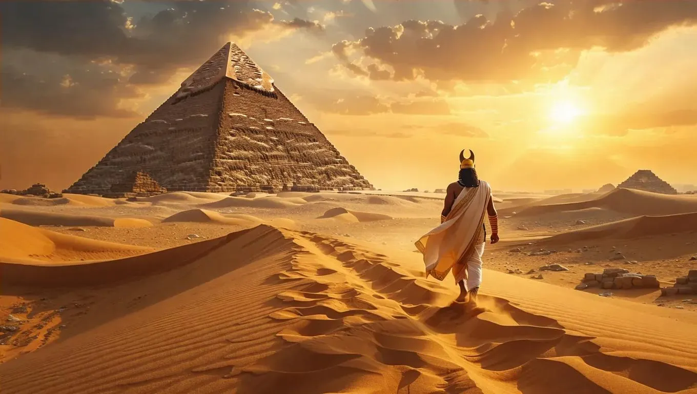Generate an epic AI image of an ancient Egyptian desert god striding through golden sand dunes under blazing sun, wind-swept cloak flowing, distant oasis shimmering. Mythological AI art capturing divine power and impending battle triumph. Create heroic deity visuals with vivago.ai's AI effects for mesmerizing desert conquest scenes.