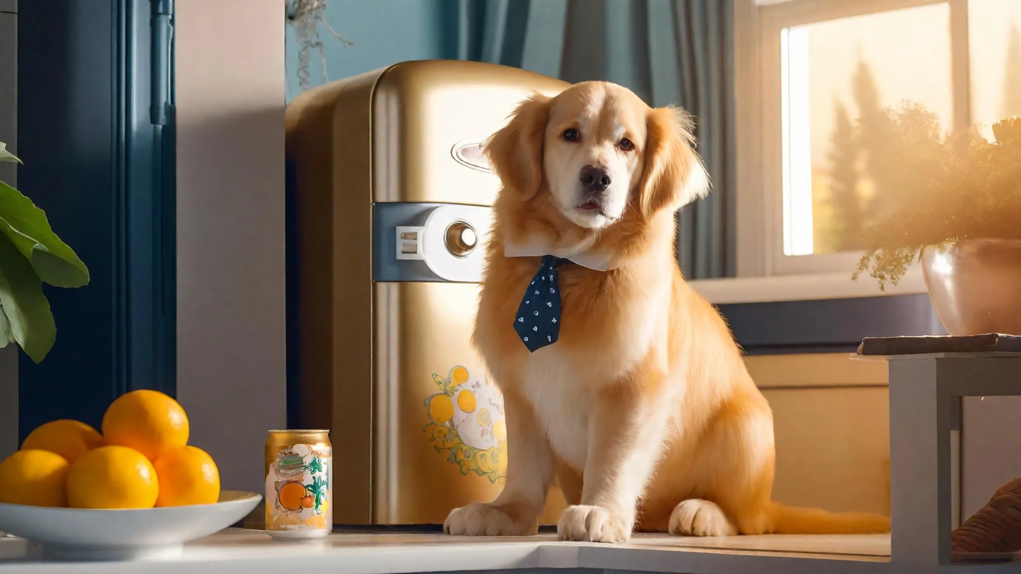 Create whimsical AI-generated images of Kumquat, a human-like golden retriever, skillfully opening fridges and selecting ingredients. Explore pet personification through AI art tools that transform text prompts into playful, imaginative visuals of dogs living freely in human environments.