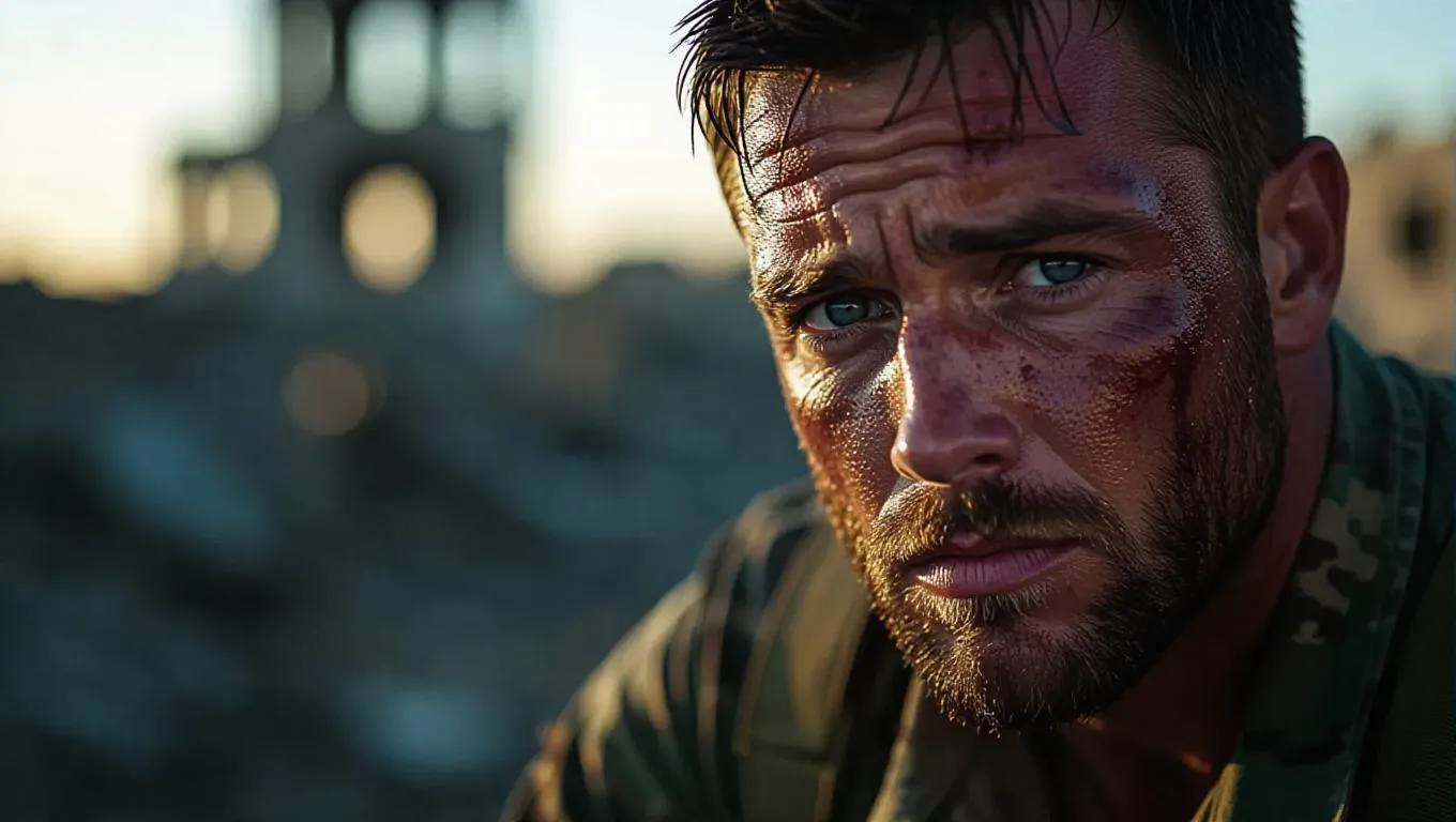 A weary soldier, gazing intensely with a sorrowful expression, his face etched with deep lines and creases, revealing the brutal hardships of war, standing prominently in the foreground, his rugged, weathered features illuminated by a soft, golden light, with a blurred background of devastation and destruction, showcasing ruins of a war-torn cityscape, photographed with a Canon EOS 5D Mark IV, paired with a 50mm f/1.2L USM lens, at a shallow depth of field, focusing on the soldier's haunting eyes, with a low ISO of 100 and a wide aperture, resulting in a hyper-realistic, ultra-detailed portrait.