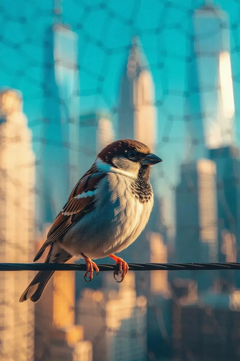 Create stunning AI-generated images of a brown sparrow perched on a wire against a blurred cityscape with towering buildings and a serene blue sky. Vivago.ai transforms text prompts into professional-grade visuals using advanced AI effects and editing tools. Enhance your creative projects with precision and style.