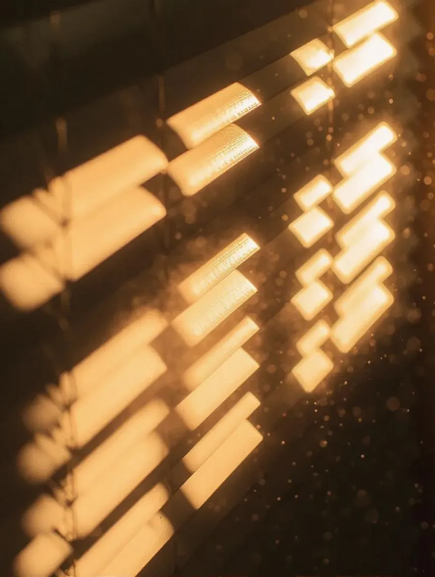Capture cinematic tranquility with AI-generated moody imagery. Sunlight streams through textured blinds, casting dramatic shadows and golden rays illuminating floating dust particles. Ethereal close-up details evoke introspective melancholy, blending warm light-dark contrasts for a dreamy, atmospheric scene.