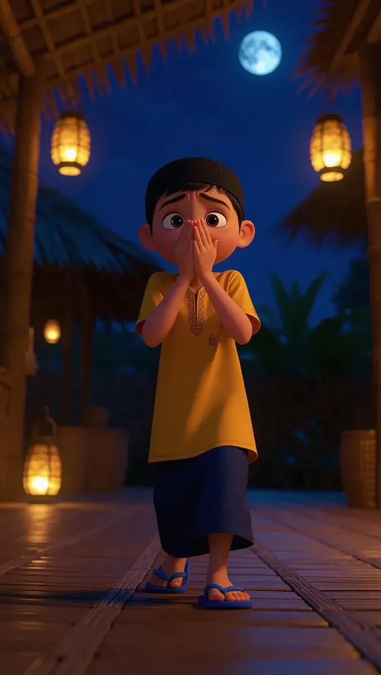 Create a charming Pixar-style animation of a 12-year-old boy in traditional Muslim attire, running embarrassed in a serene bamboo mosque yard at night. Generate expressive characters and vivid scenes with vivago.ai's AI image tools for professional-grade, culturally rich visuals.