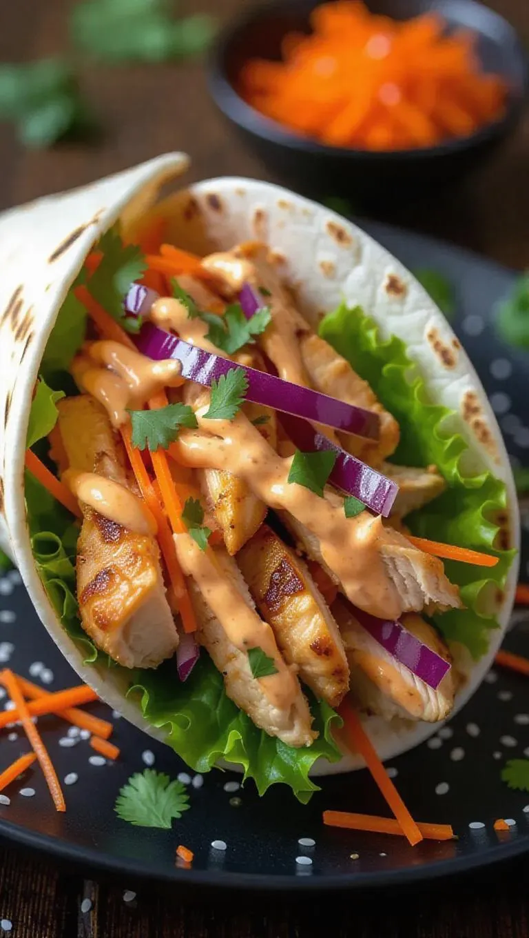 Create a zesty Thai Chicken Wrap with grilled chicken breast, crisp lettuce, carrots, cilantro, and crunchy Asian noodles, blended with spicy Thai chili sauce and mayo. Wrapped in a warm flour tortilla for a vibrant, protein-packed meal. Perfect for quick lunches or flavorful dinners. Explore AI-enhanced recipes for professional culinary creativity.