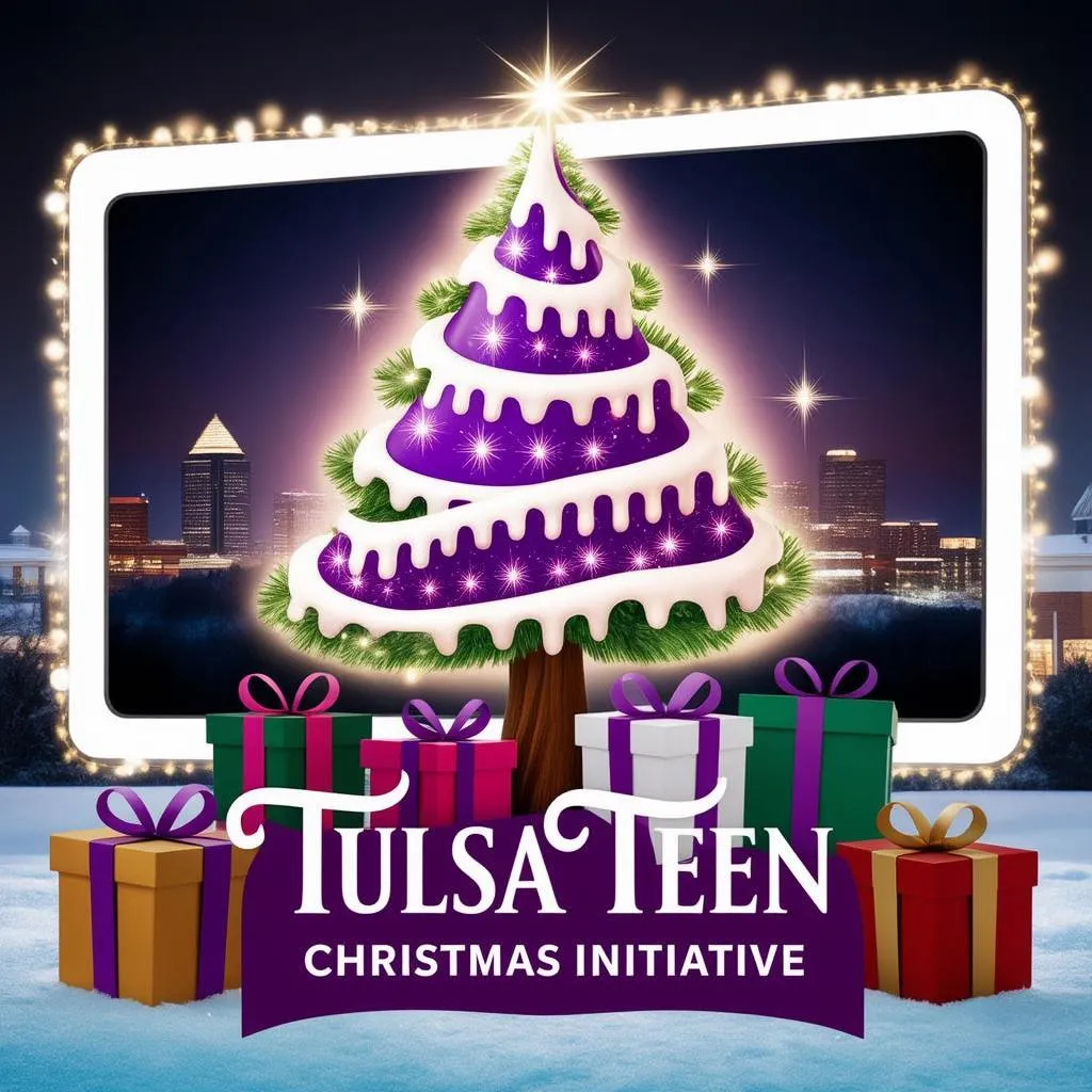 Create a vibrant AI-generated Christmas logo with a purple-and-white iced tree, glowing lights, and festive gifts for Tulsa Teen Christmas Initiative. Perfect for a Tulsa non-profit logo, blending holiday cheer with teen-focused branding to promote annual present donations for Oklahoma youth aged 13-18.