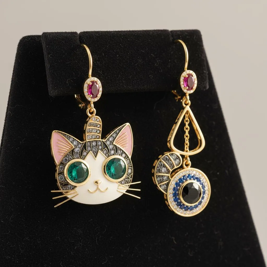 "Create a pair of ear rings inspired by the reference image of the picture symbol. The collection should include :ear rings should integrate elements of the picture. Designs should look elegant, luxurious, and detailed, with gold as the primary material, complemented by gemstones (e.g., emeralds, rubies, sapphires). Make sure each piece is distinct but visually connected as part of one collection."