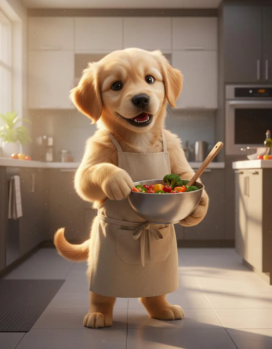 Transform the reference pet photo into a cinematic anthropomorphic character. The pet should stand upright like a human, wearing a cooking apron, working in a modern kitchen. The character is holding a bowl of vegetables, cooking with a warm and lively expression. The style should be ultra-realistic, detailed textures, dramatic lighting, and dynamic composition, like a Pixar-quality movie still. The design must keep the pet’s unique facial features and recognizable appearance from the reference photo.