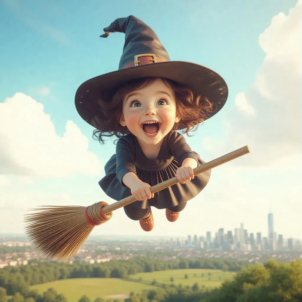 Experience a realistic, enchanting AI-generated image of a joyful toddler witch with an excited expression, soaring on a broomstick in a vibrant hat. Serene landscape with lush greenery, distant city skyline, and fluffy clouds in a bright, cheerful palette. Captures magical, playful moments.