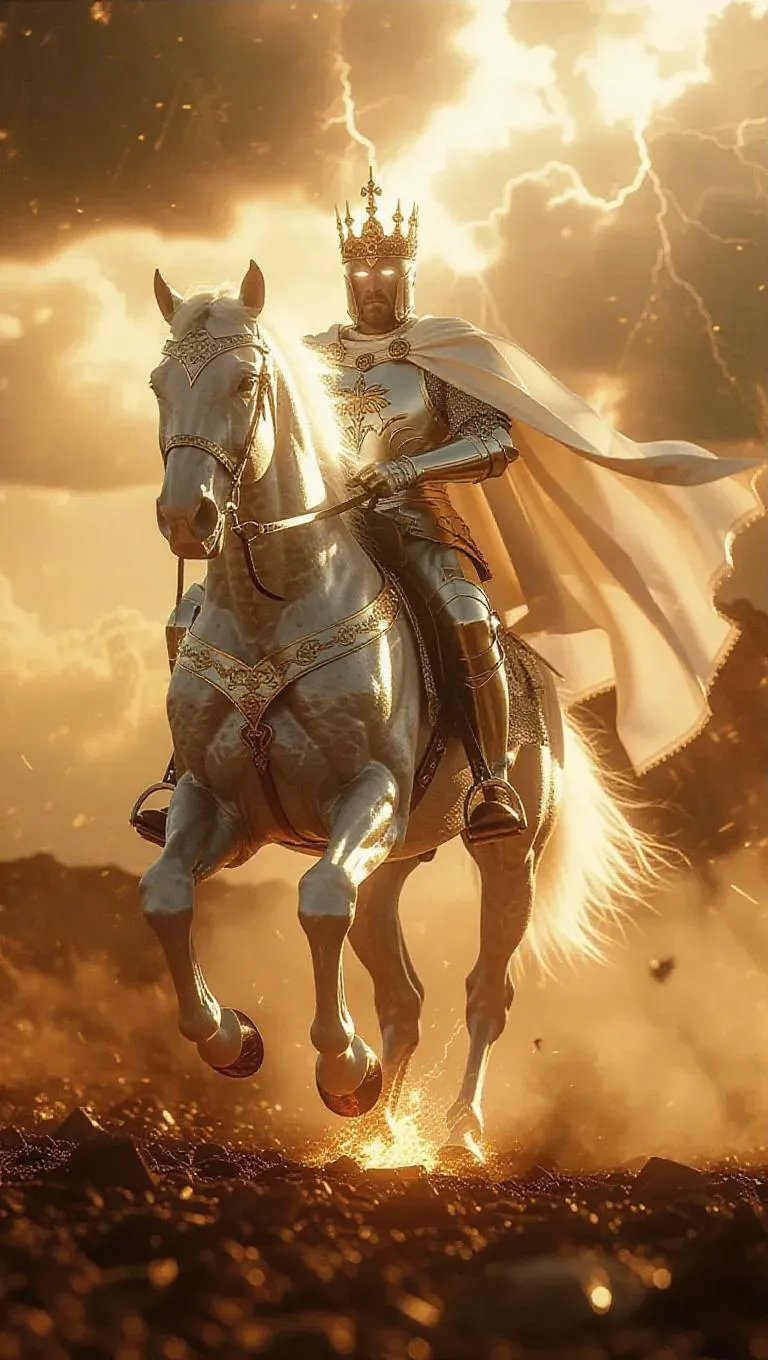 Experience apocalyptic biblical fantasy with this ultra-realistic 4K render of a divine conqueror: armored rider on a lightning-hoofed steed, radiating dark celestial energy amid shattered golden plains. Cinematic lighting highlights surreal details—glowing eyes, fiery snorts, storm-lit conquest waves—blending surrealism and hyperrealism for a hauntingly majestic vision of merciless divine judgment.