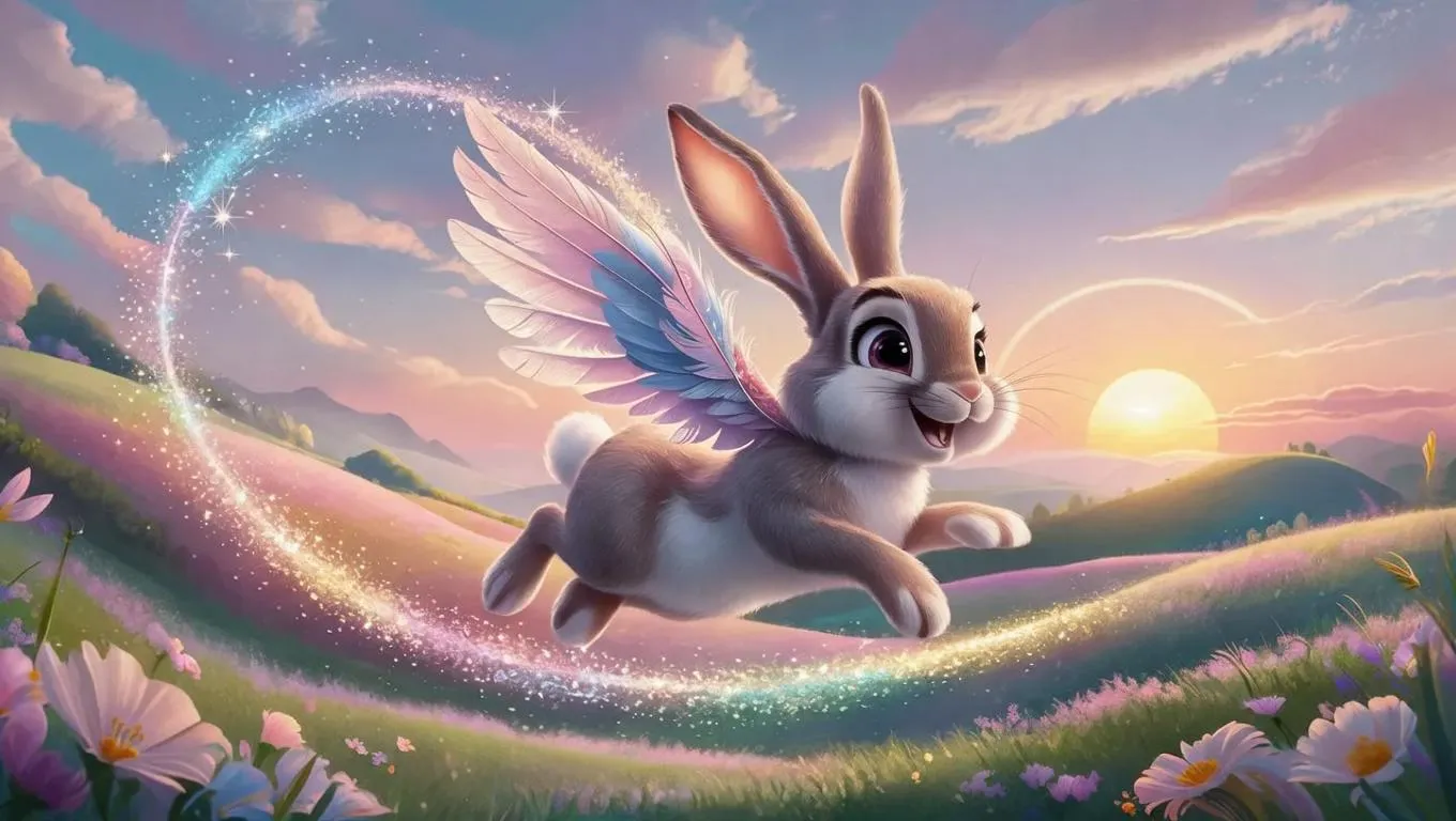 Generate a Pixar-style 3D animation of a winged rabbit soaring through pastel skies with sparkling stardust, blending Disney-inspired whimsy and anime motion design. AI transforms this prompt into magical cartoon visuals—feather-adorned creatures, blooming hills, and sunset horizons. Perfect for enchanting AI art, video projects, and dynamic motion graphics with professional-grade Dune-inspired fantasy elements.