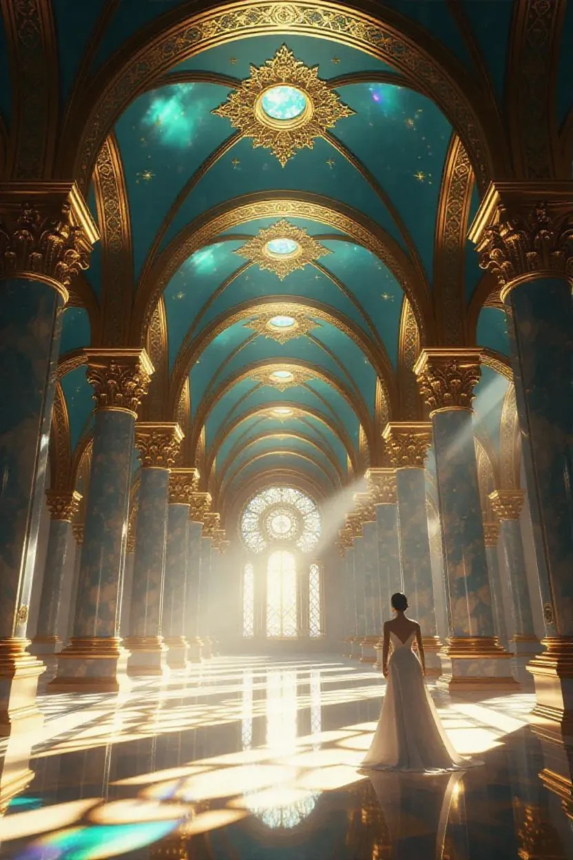 A celestial marble cathedral rises skyward, vaulted arches adorned with gold-leafed celestial murals, sunlight fracturing through intricate stained glass to paint polished floors in prismatic rivers. Colossal arched portals lead to weightless temple complexes, jade pagodas and crystal spires emerging from aurora-lit cumulus clouds in gradients of molten pearl and hydrangea blue. Divine light shafts illuminate drifting stardust and floating scripture fragments. Polyart's hyper-saturated palette captures iridescent cloud particles, etched bronze door reliefs, and ghostly silhouettes of winged deities in distant rainbow mists, framed vertically in dramatic 2:3 ascension.