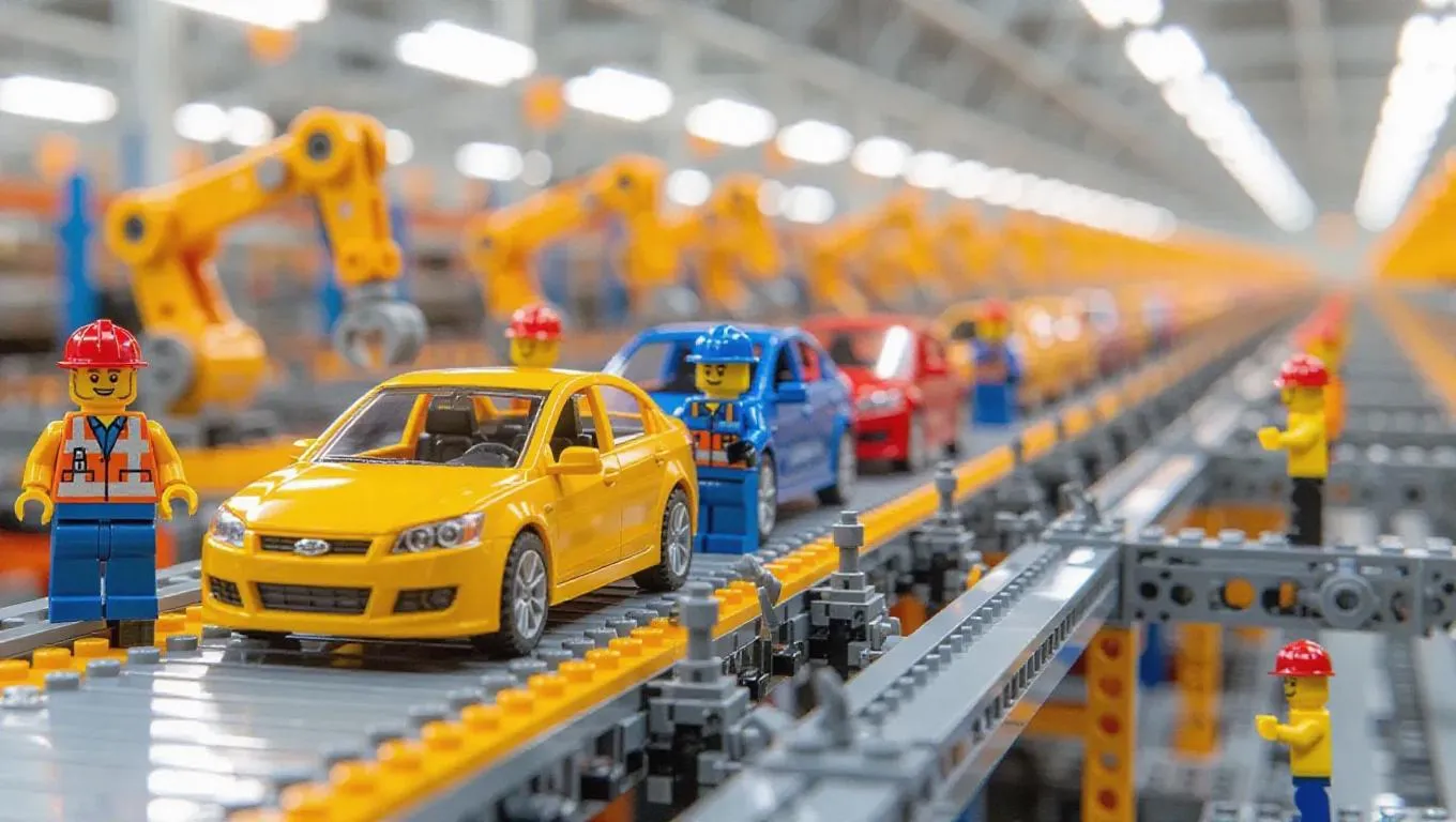 Transform your ideas into AI-generated visuals with VivaGo.ai. Explore a bustling car factory assembly line where action figure workers build real cars using Lego machines and plastic toy tools. Elevate your creative projects with our AI-powered image generation and professional editing tools.