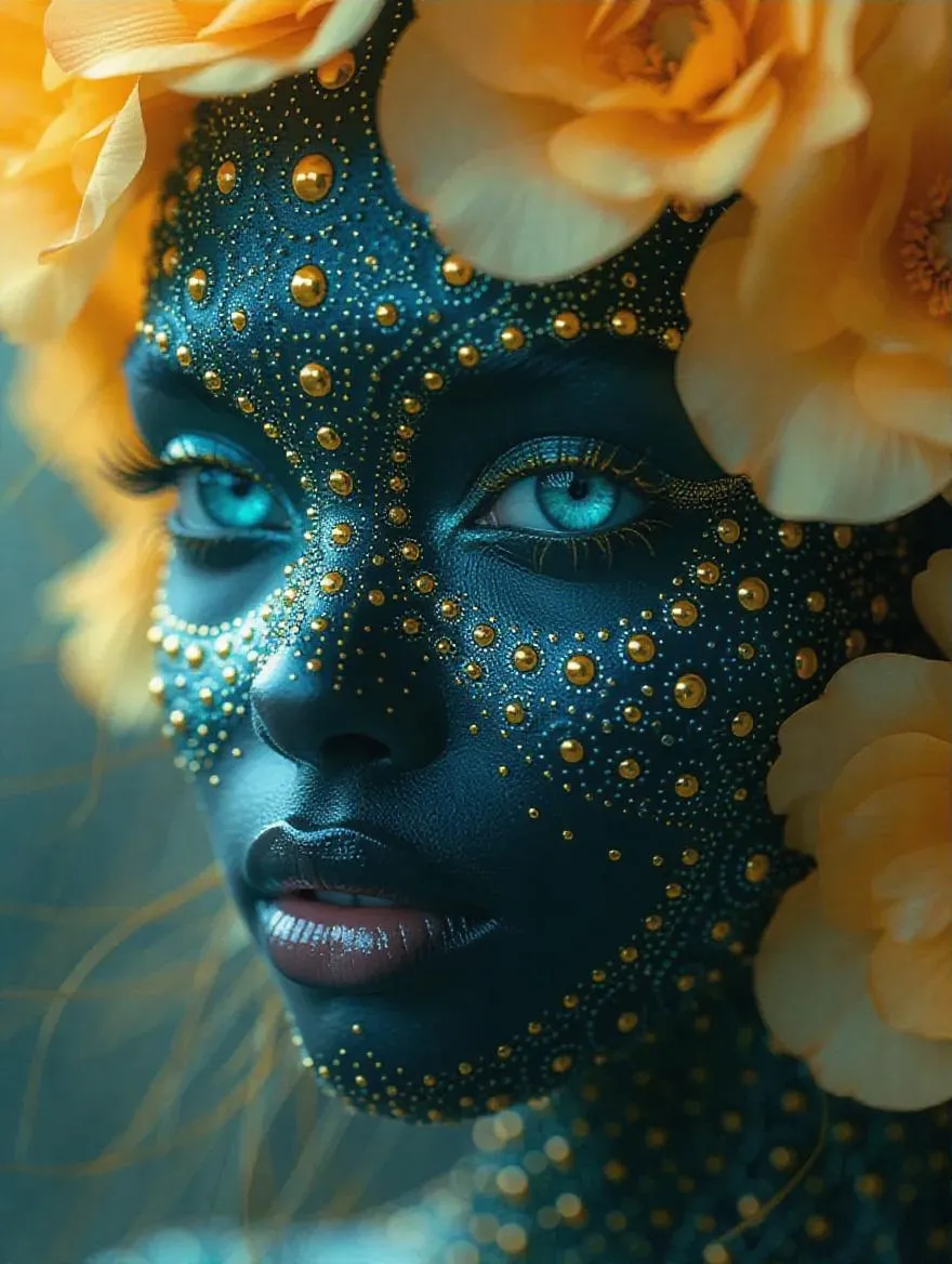 Generate surreal floral portraiture art featuring an alien with vibrant green-blue and bright-yellow hues. Transform your concepts into captivating AI visuals. Explore AI effects for striking, imaginative creations with Vivago.ai's professional tools.